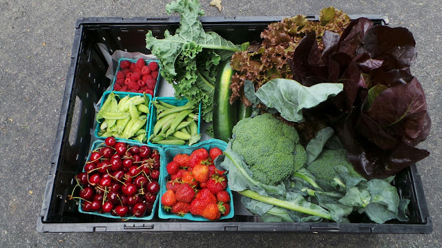5:49 AMI see now that I wrote about my projects last week, but failed to explain what was in our CSA box. Well, we got 1 bunch beets, 1 bunch radishes, 2 quarts sour cherries, 1 pint blueberries, 1 pint wax beans, 3 cucumbers, 3 small zucchini, and a head of red leaf lettuce.
